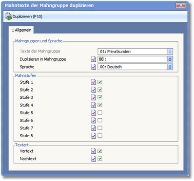 In den folgenden Feldern können Sie selektieren, welche Mahntexte der Mahngruppe dupliziert werden sollen.